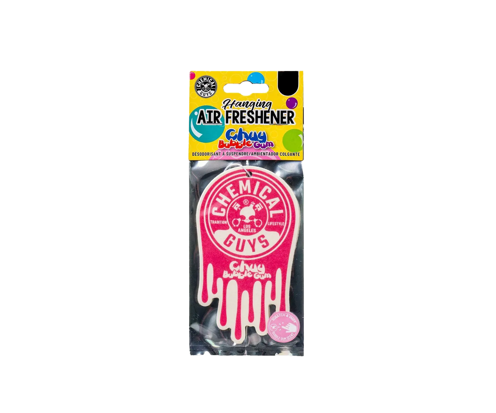 Chemical Guys Chuy Bubble Gum Scent — картонный подвесной ароматизатор для авто, компактная версия нейтрализатора запахов Chemical Guys Chuy Bubble Gum. Это стильная подвеска с фирменным логотипом бренда, которая легко крепится на зеркало заднего вида и эффектно дополняет интерьер любого автомобиля. Благодаря особой технологии удерживания аромата обеспечивает равномерное высвобождение активных молекул на протяжении нескольких недель без снижения интенсивности.