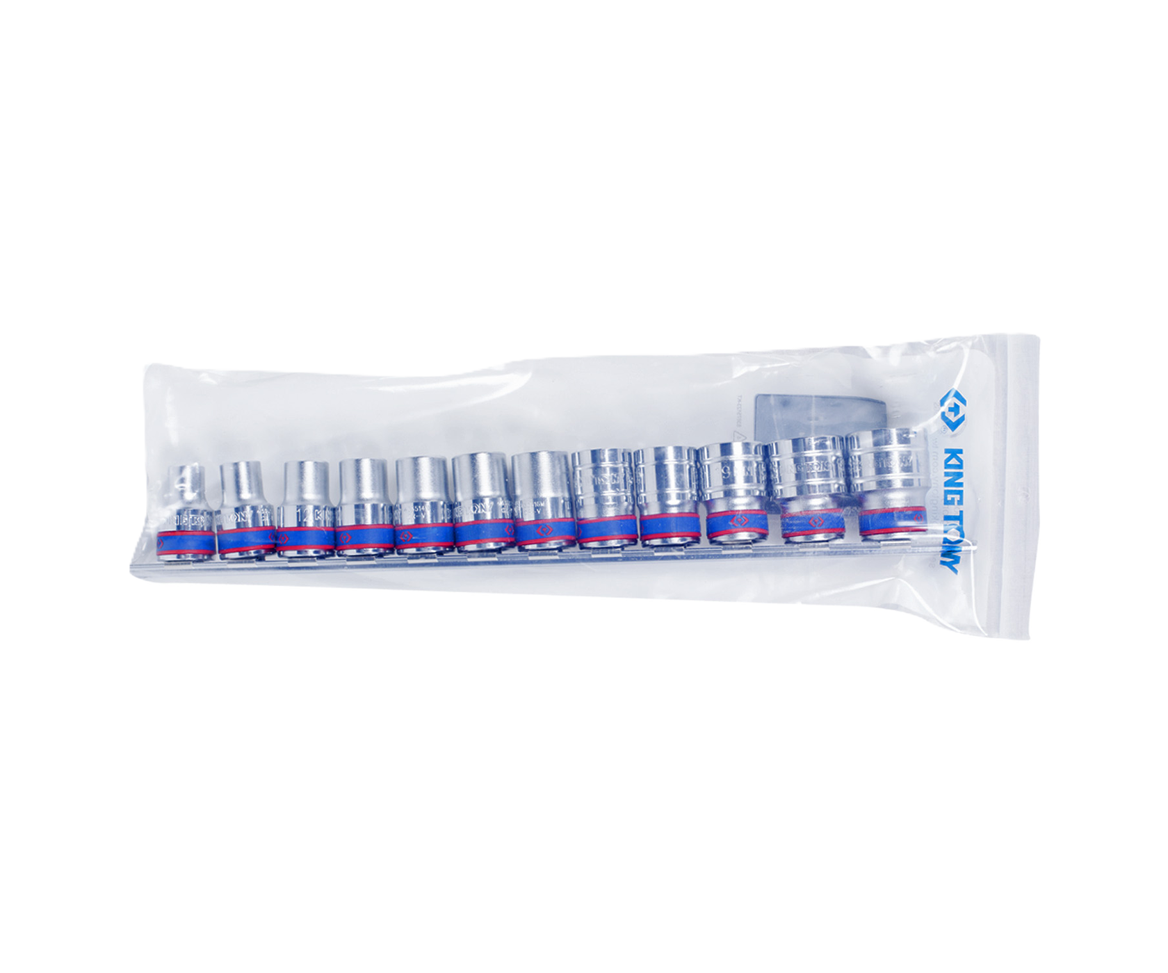 King Tony ½" DR. 6 Point Socket Rail Set 12 pcs – набор из 12 торцевых головок длиной 28 мм с шестигранным внутренним профилем на планке для ручного и электроинструмента. Выполнены из легированной хромомолибденовой стали. На боках головок выгравированные лазером их артикулы.