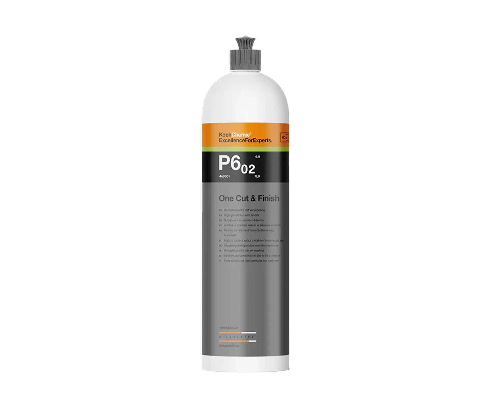 One Cut & Finish P6.02 1 L – полировальная паста с зерном средней абразивности, воском карнауба и полиорганосилоксанами. Она – усовершенствованная версия пасты One Cut & Finish P6.01, может использоваться как самостоятельное решение для полировки (в качестве одношаговой пасты), либо как завершающий этап после грубых полировальных паст. Эффективна в удалении лёгких и средних дефектов лакокрасочного покрытия, царапин, голограмм, завихрений и рисок абразивов с зернистостью от Р2000. Придаёт поверхностям глянцевый блеск.