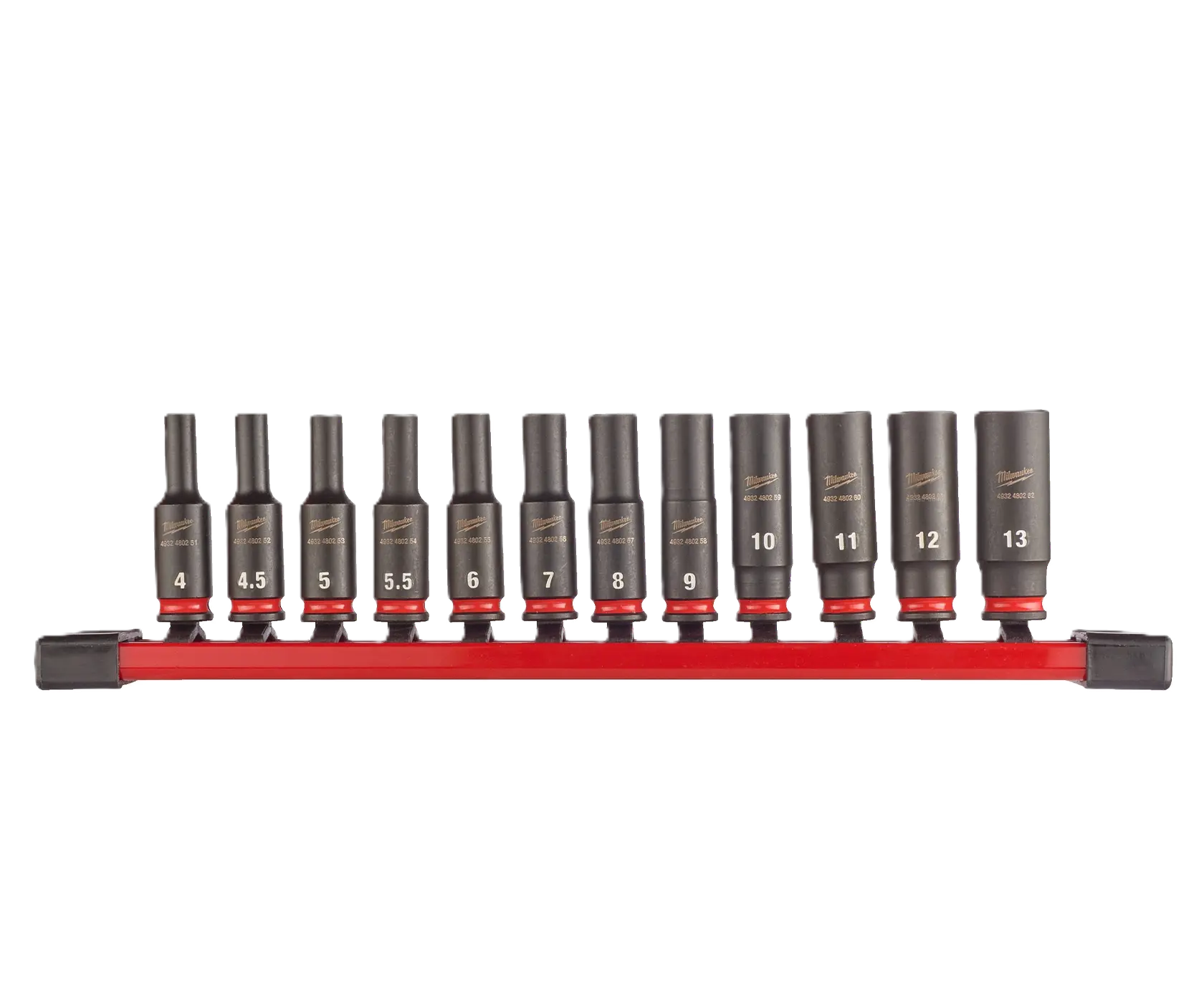 Milwaukee ¼" Impact Socket Set 12 pc – набор из 12 удлинённых ударных торцевых головок с квадратным внутренним профилем на планке. Подходят для работы с высокими нагрузками с использованием ударных инструментов. Могут использоваться также для ручного инструмента. Выполнены из легированной хромомолибденовой стали.