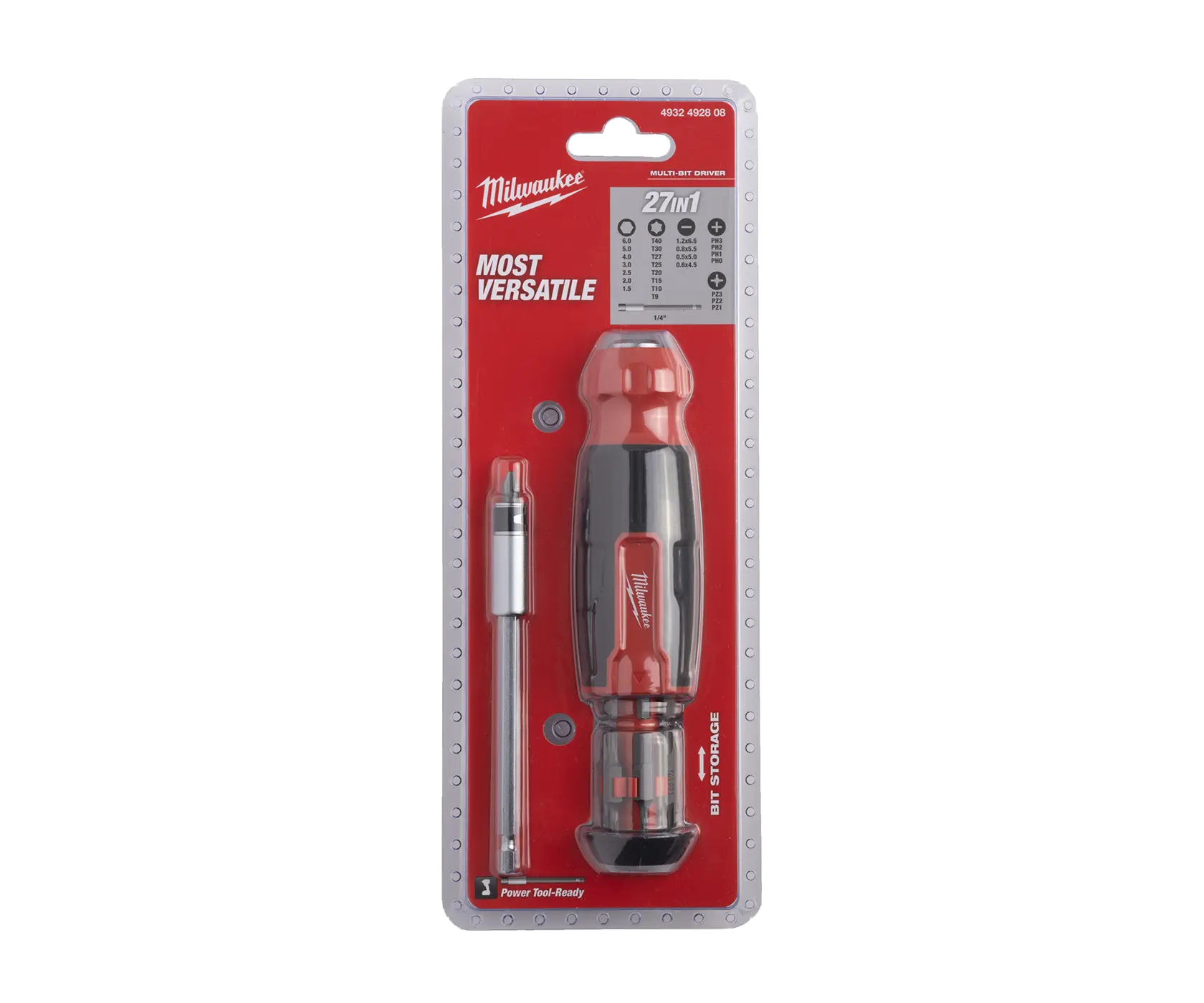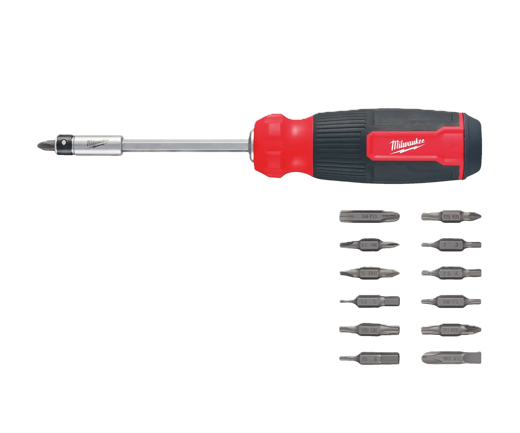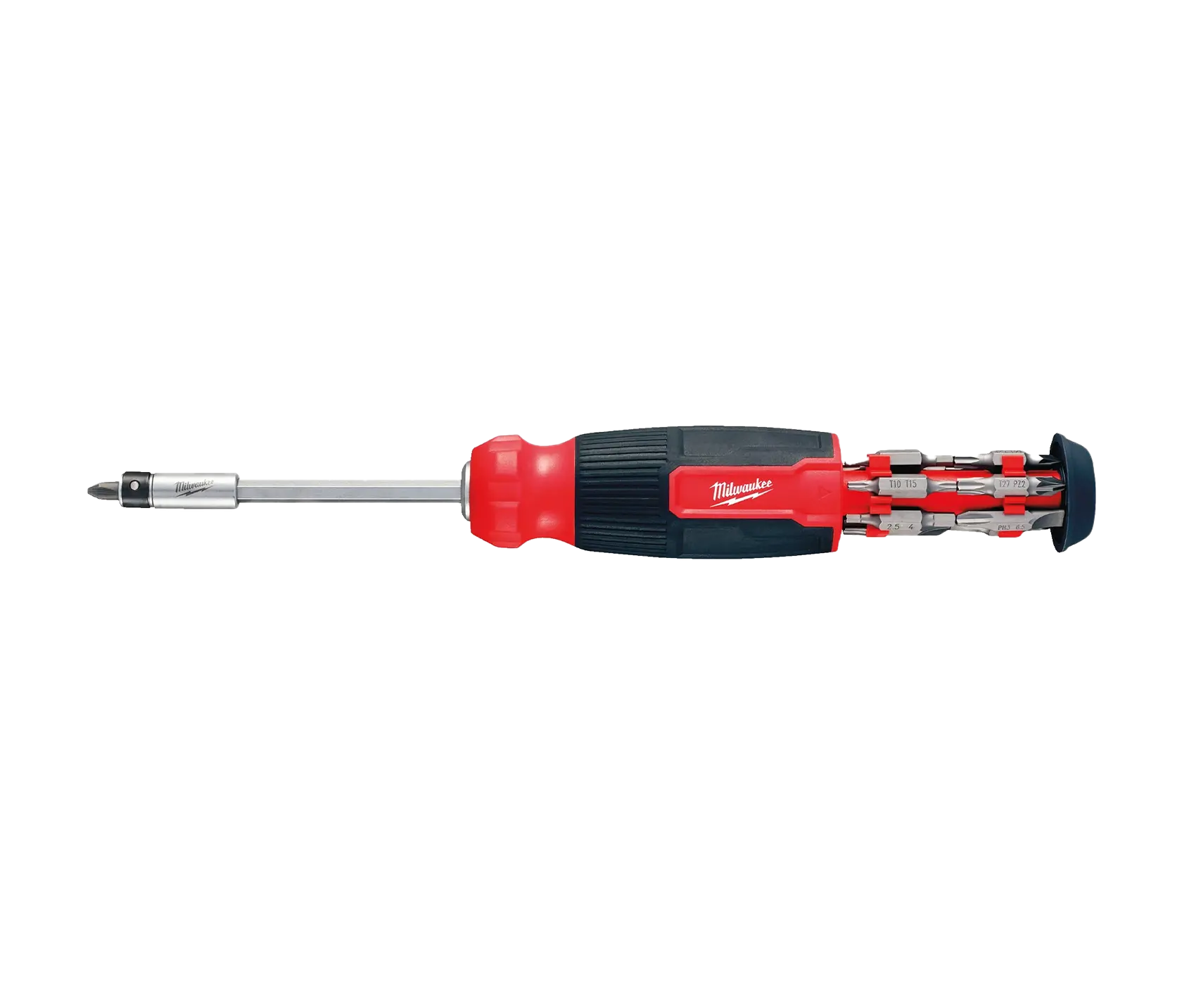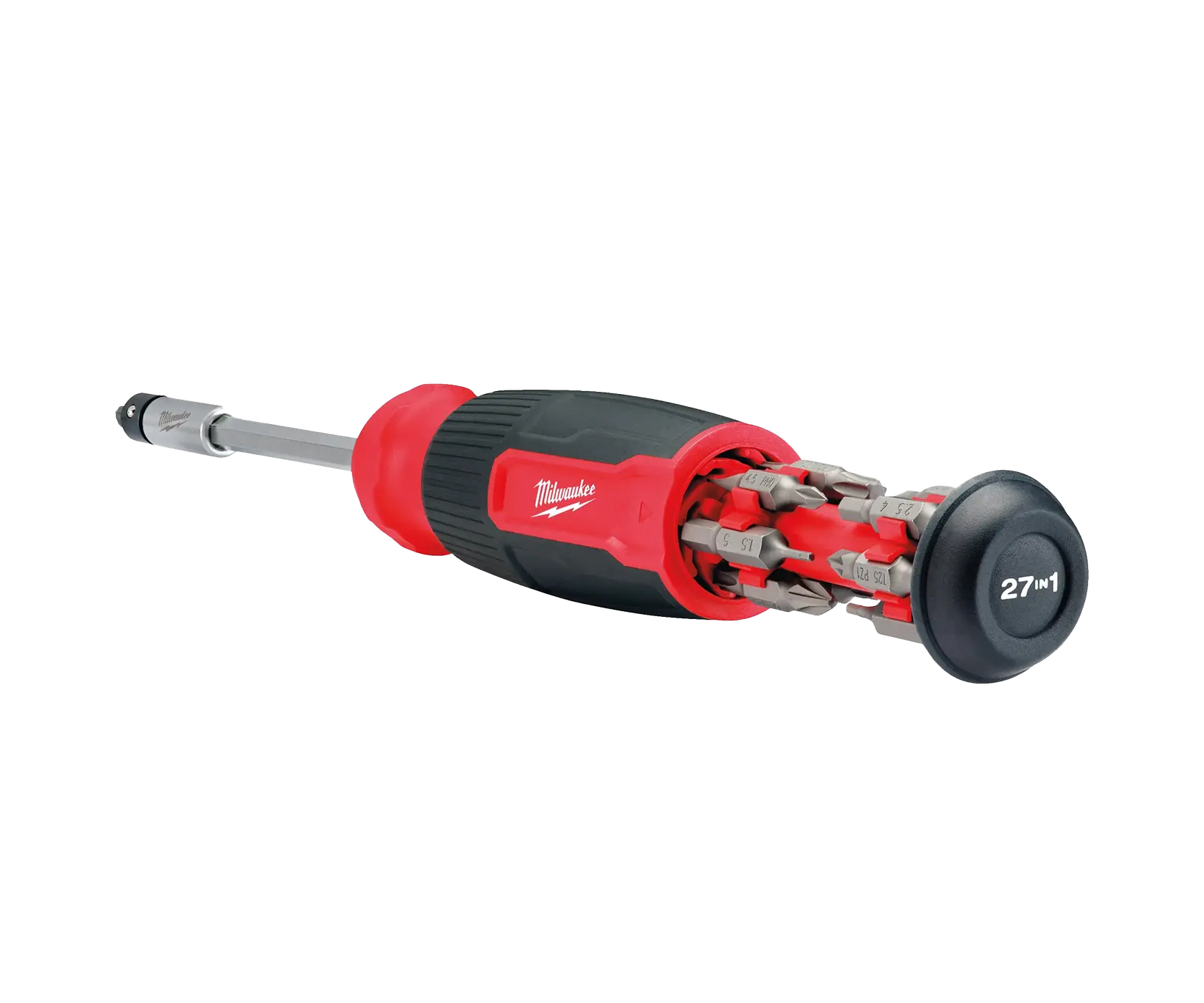 Milwaukee 27 in 1 Multi-bit Screwdriver – компактная универсальная отвёртка для работы в ограниченном пространстве. В её рукоятке – отсек револьверного типа с лёгким и быстрым доступом для хранения бит. Всего в наборе 13 бит с шестигранными (HEX) хвостовиками ¼ дюйма. При необходимости их можно использовать совместно с электроинструментом.