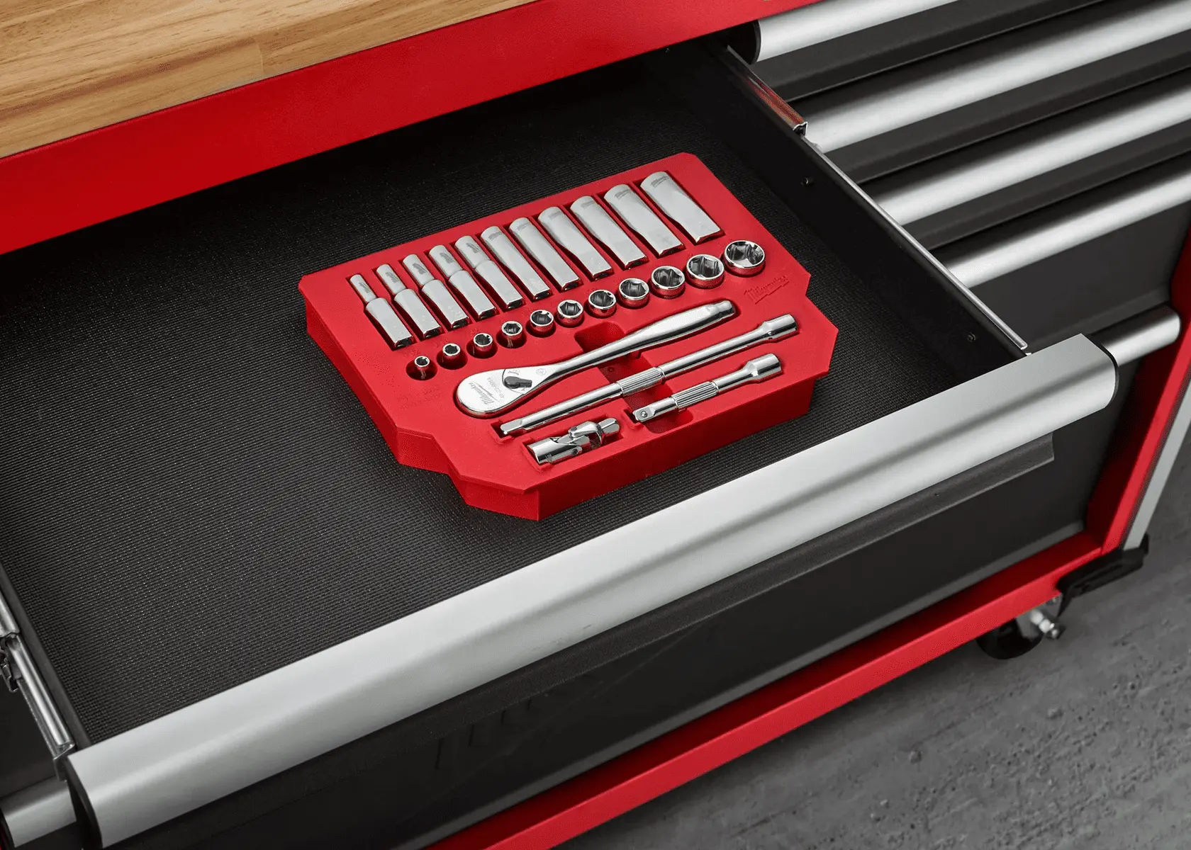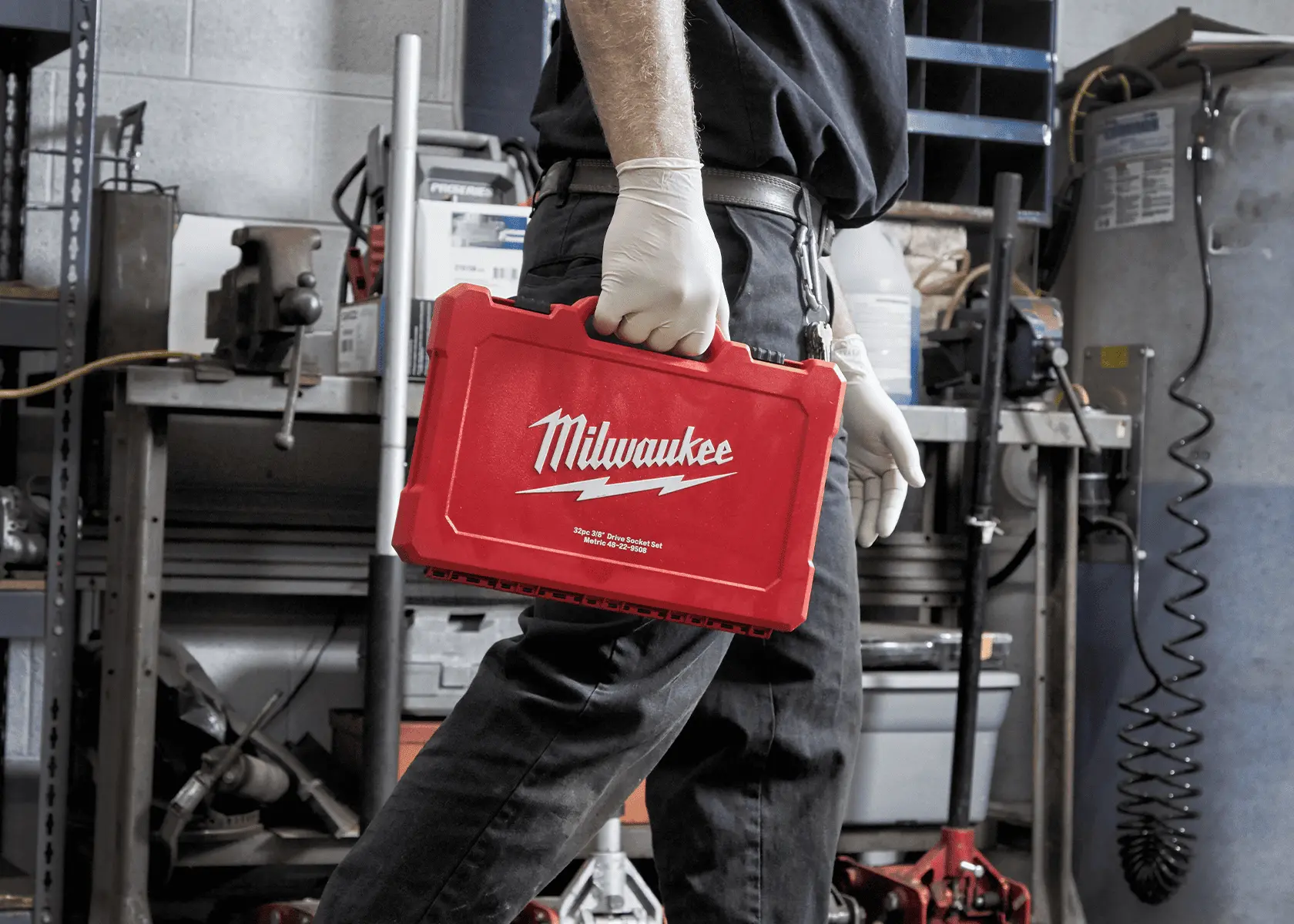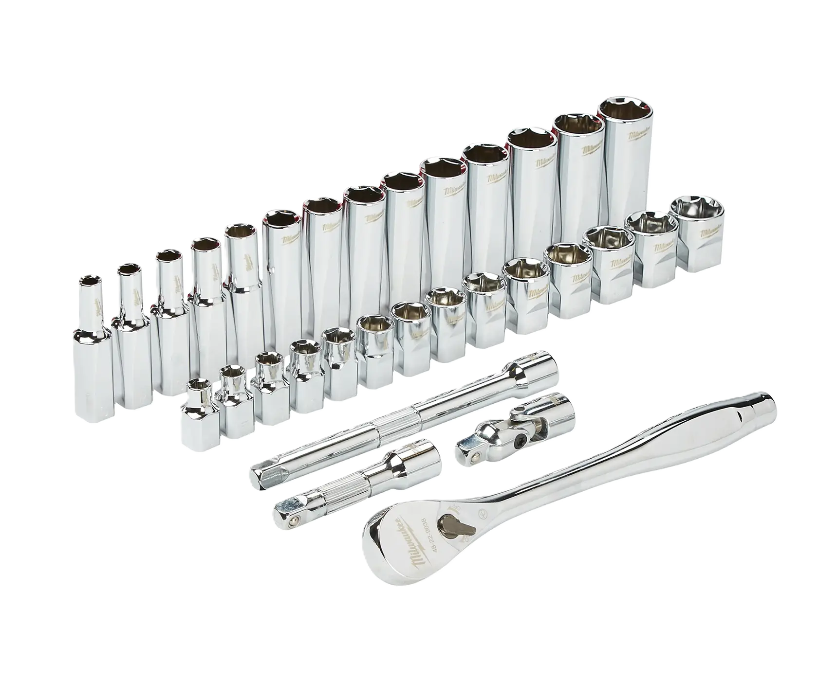 Milwaukee ⅜″ Ratchet & Driver & Socket Set 32 pc – набор ударных головок с трещоткой с квадратом 3/8 дюйма. Трещотка оснащена механизмом на 90 зубьев, что обеспечивает малый рабочий угол поворота в 4°. Это позволяет эффективно работать в стеснённых условиях, где пространство для хода инструмента ограничено. Храповой механизм обеспечивает плавную работу, чёткий реверс и устойчивость к нагрузкам.