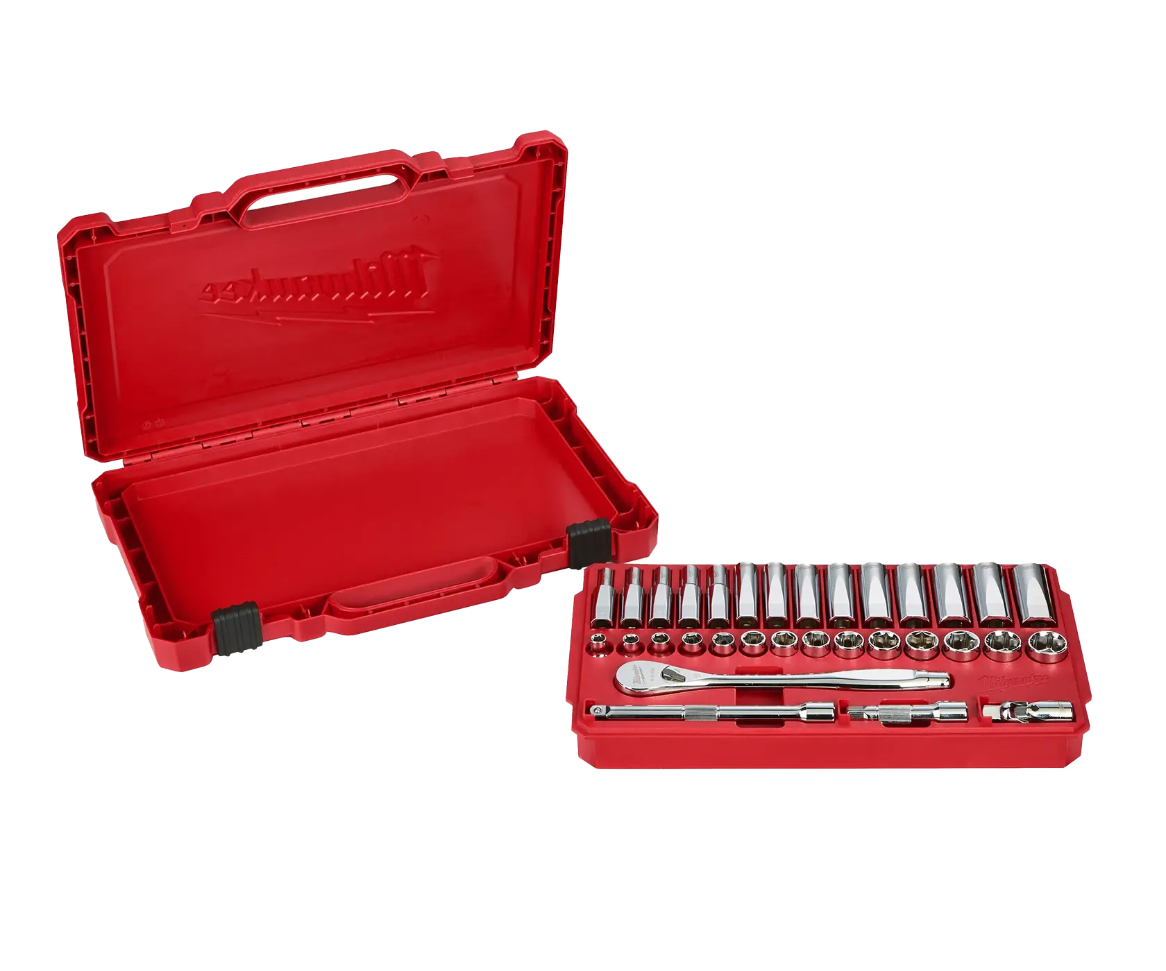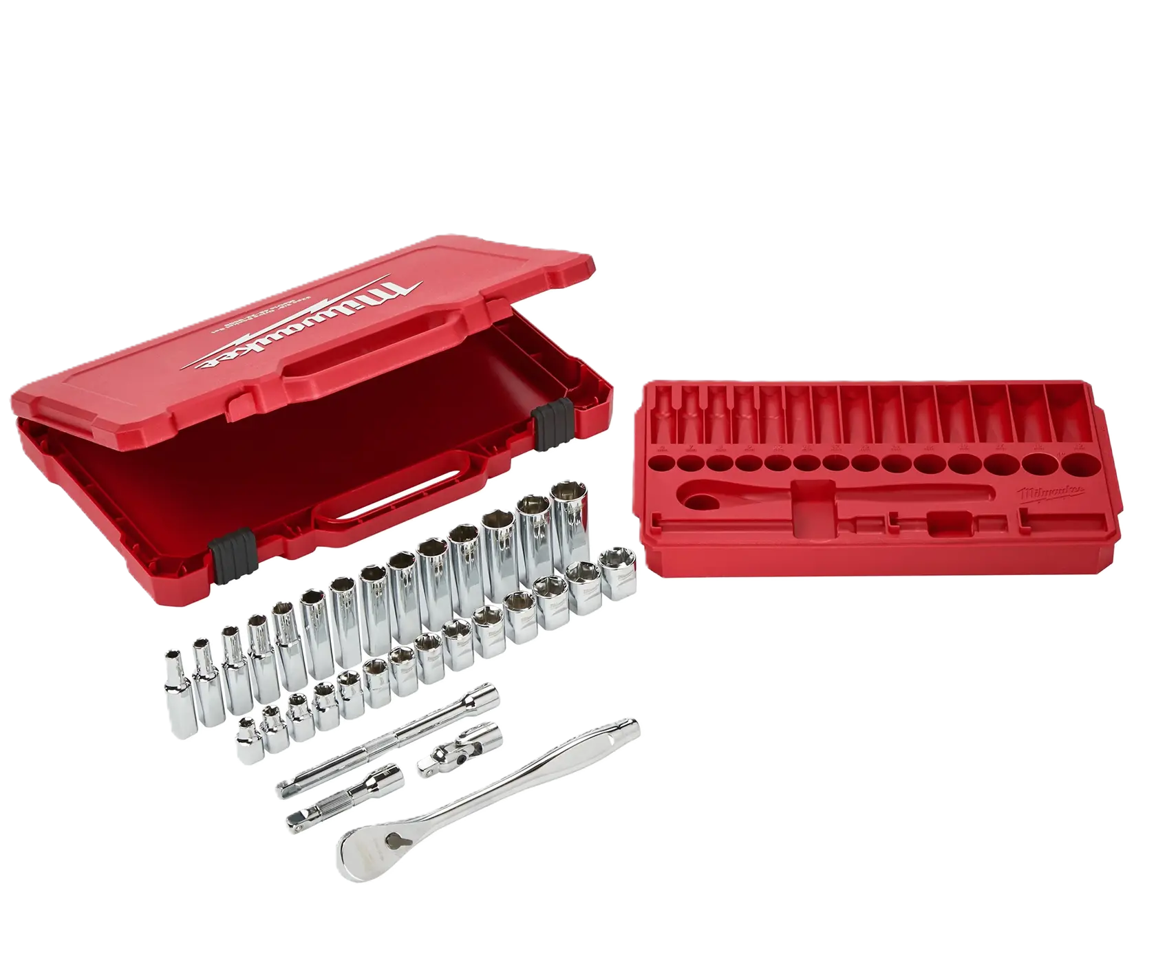 В набор Milwaukee ⅜″ Ratchet & Driver & Socket Set 32 pc входит: