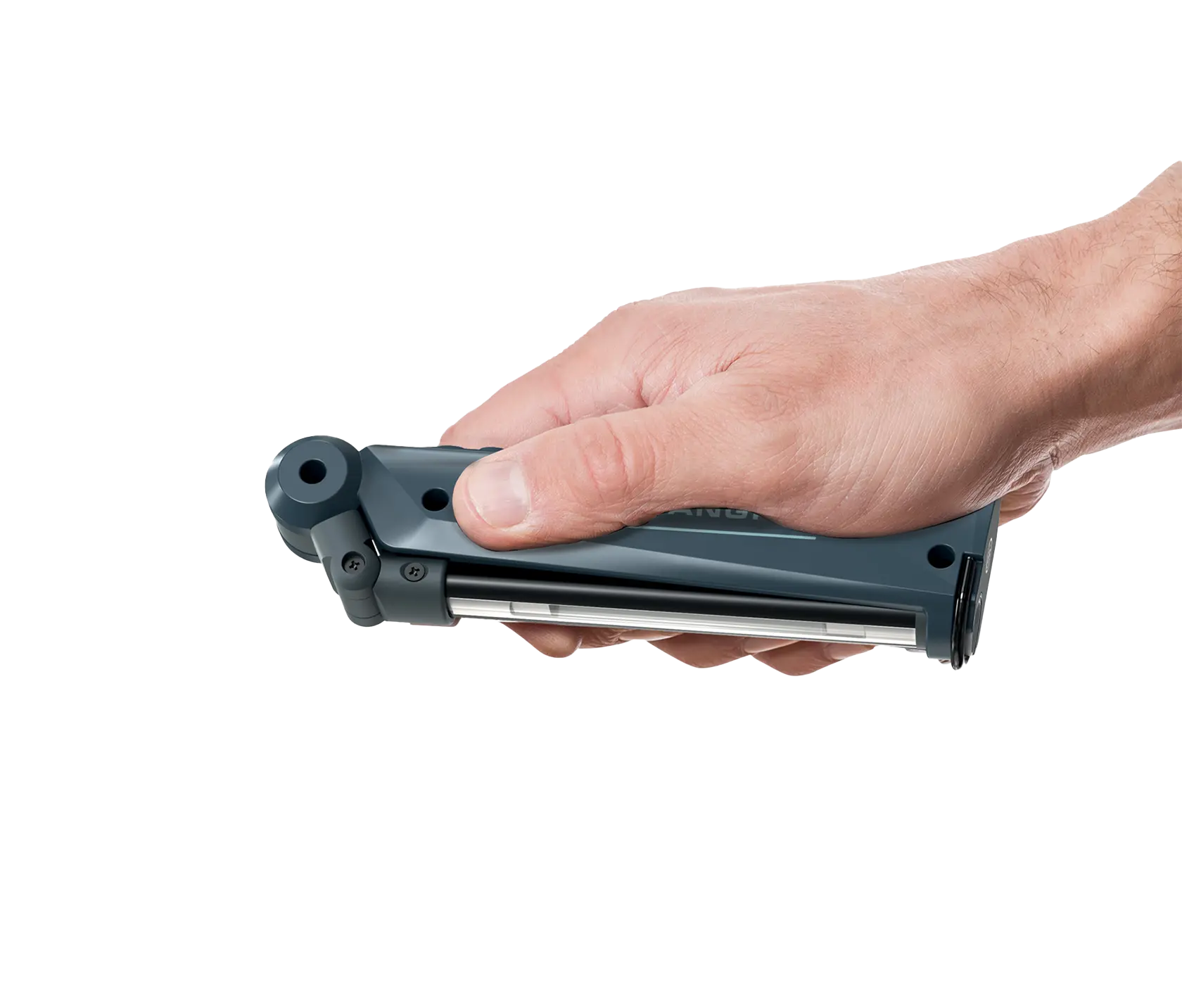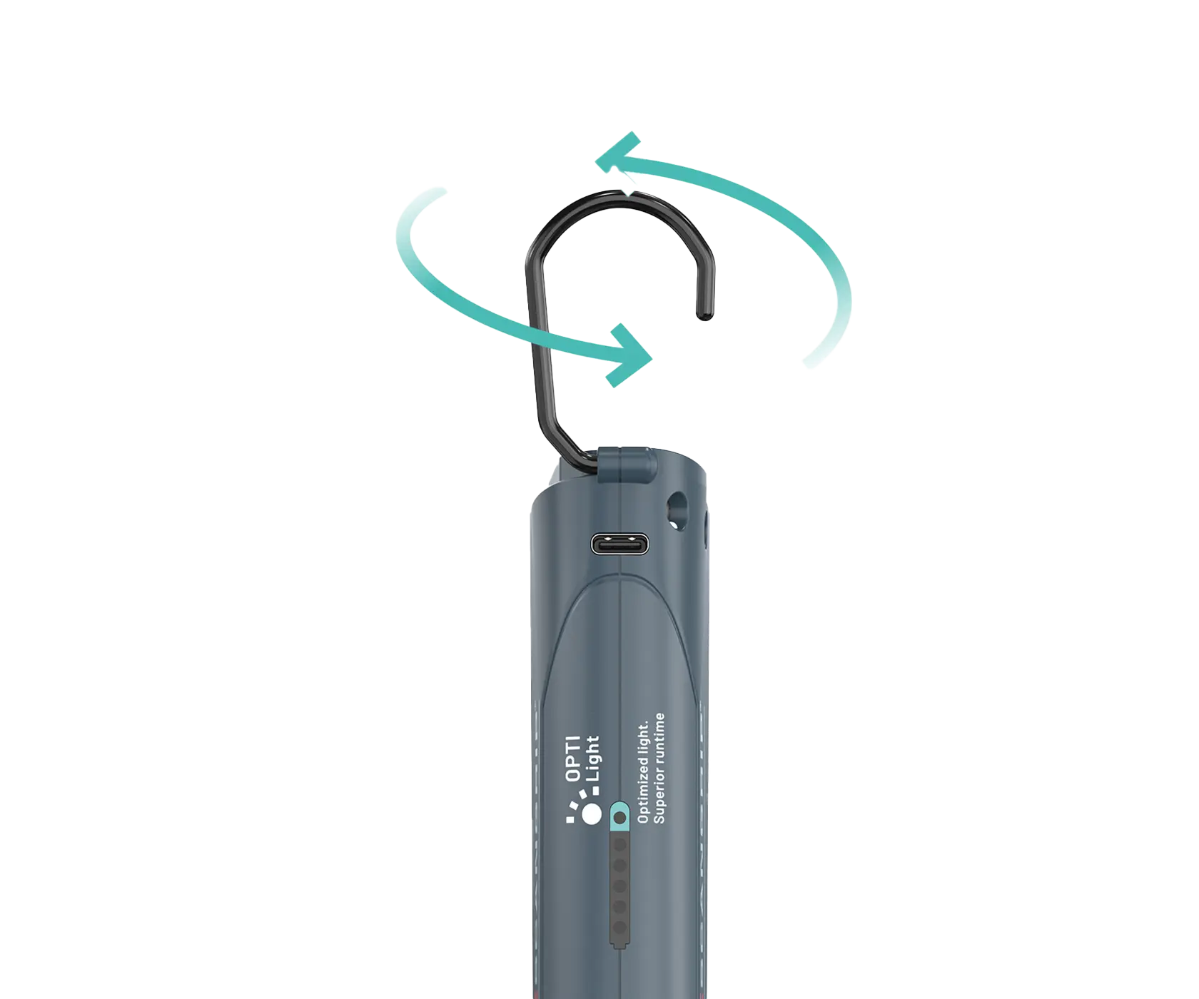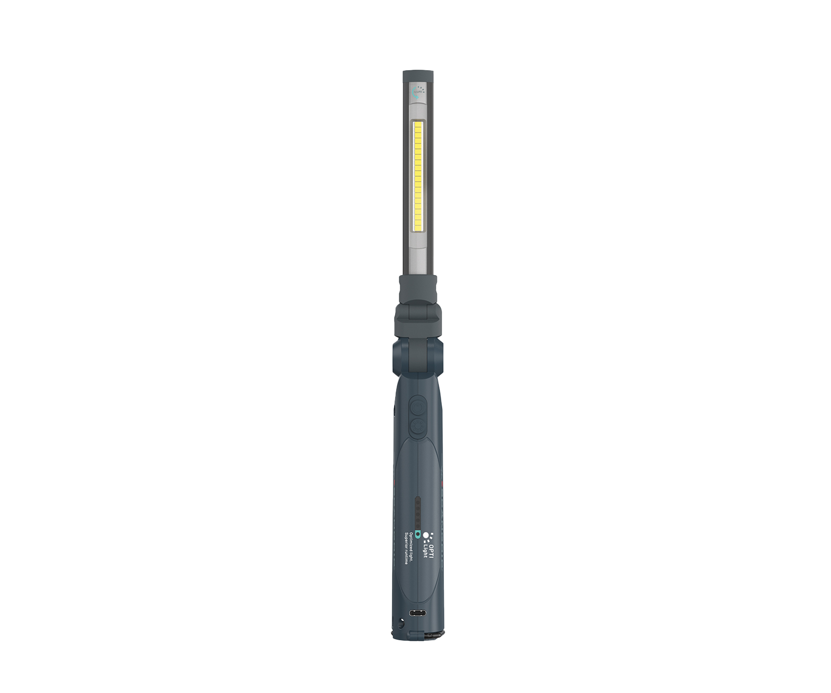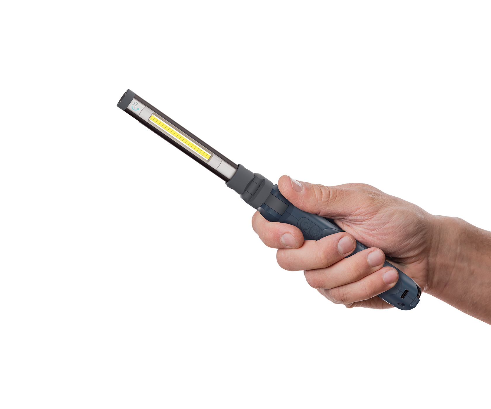 Конструкция корпуса позволяет полностью складывать фонарь. Благодаря встроенному магниту и прочному поворотному крюку он превращается в рабочий свет с максимальным световым потоком 500 люмен. Как в сложенном, так разложенном виде его также можно использовать как точечный (поисковый) свет со световым потоком 100 люмен благодаря диоду в торце инспекционной головки.