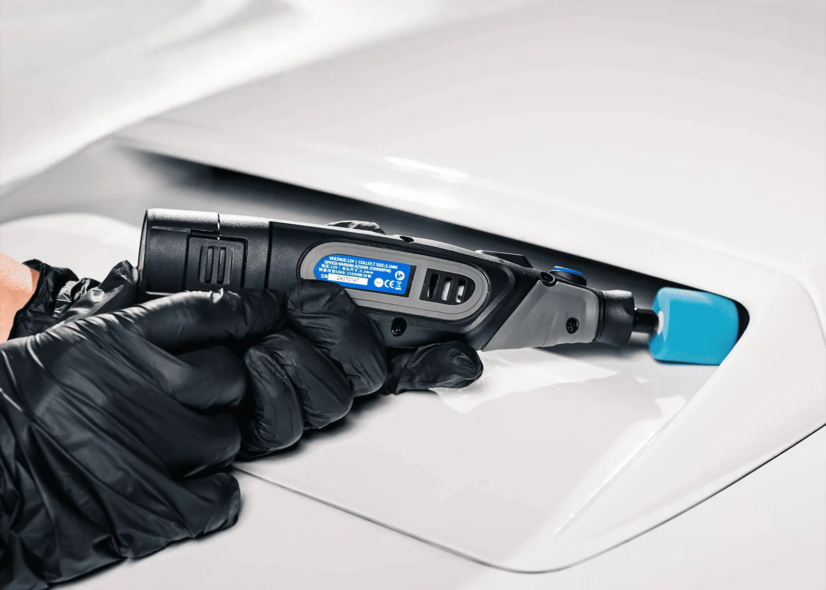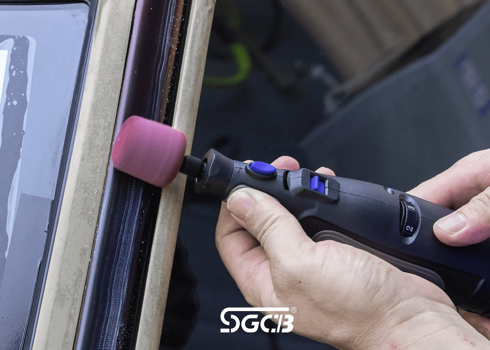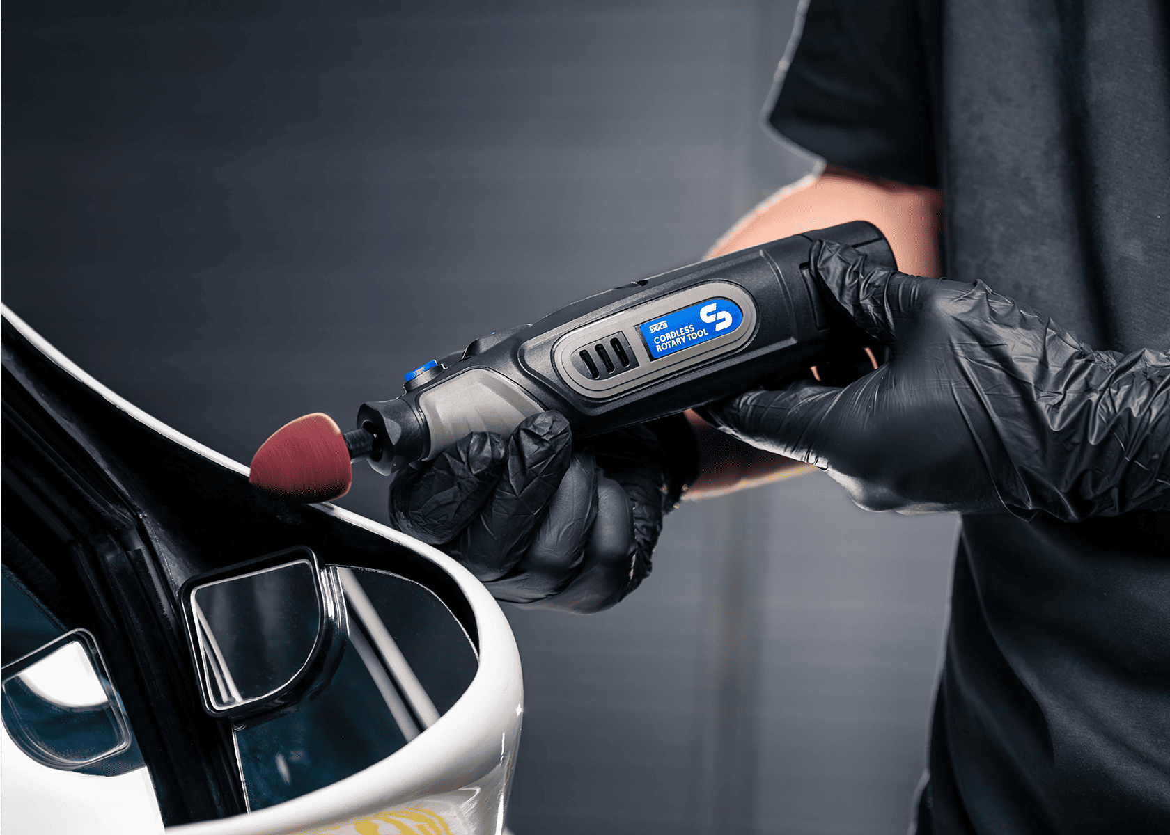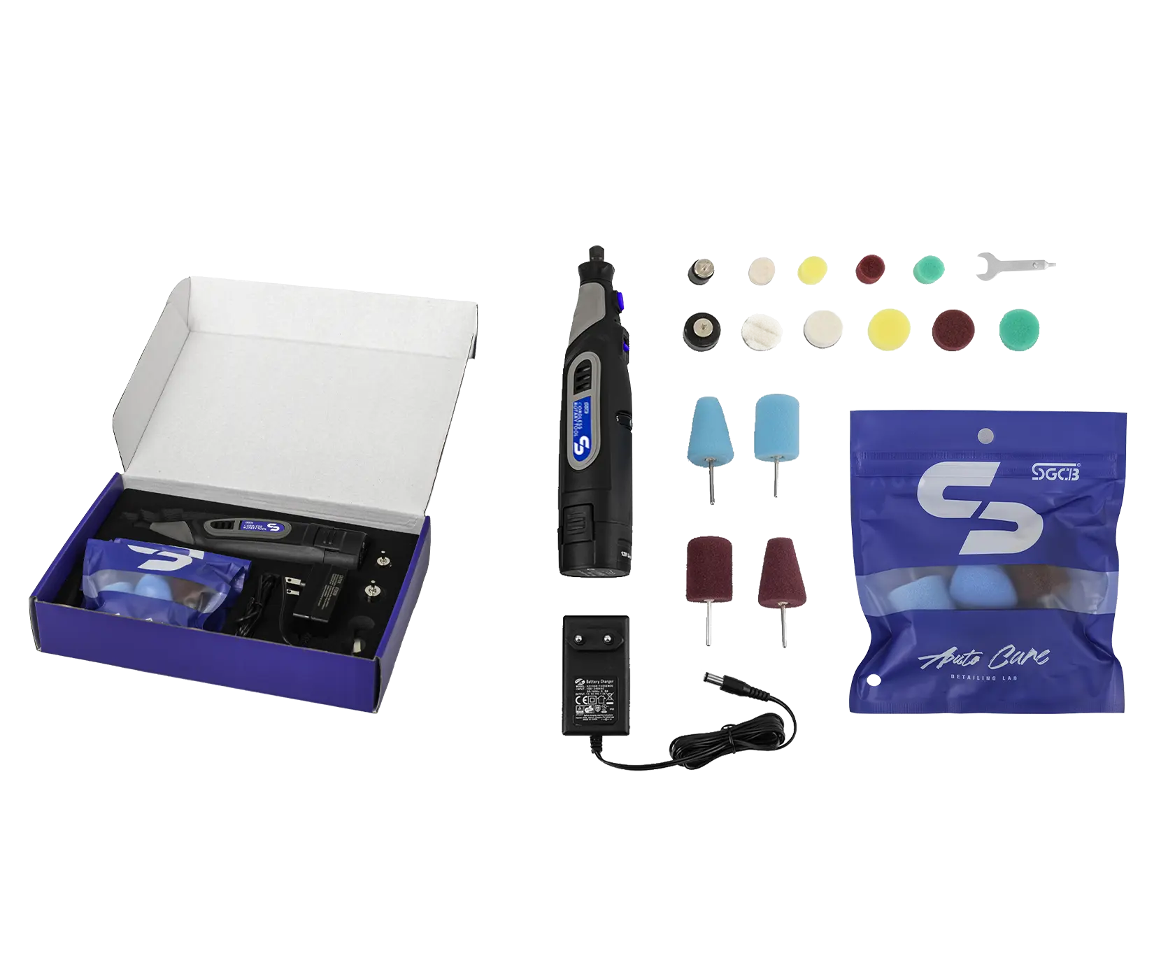 SGCB Cordless Rotary Tool — аккумуляторная полировальная машина роторного вращения со сменными насадками. Позволяет работать там, где проводной инструмент обычного размера не работает. Лучше всего справляется с задачами по полировке сложных деталей и труднодоступных мест кузова: стойками, проёмами, рёбрами, радиаторными решётками. Также может использоваться для полировки элементов салона.