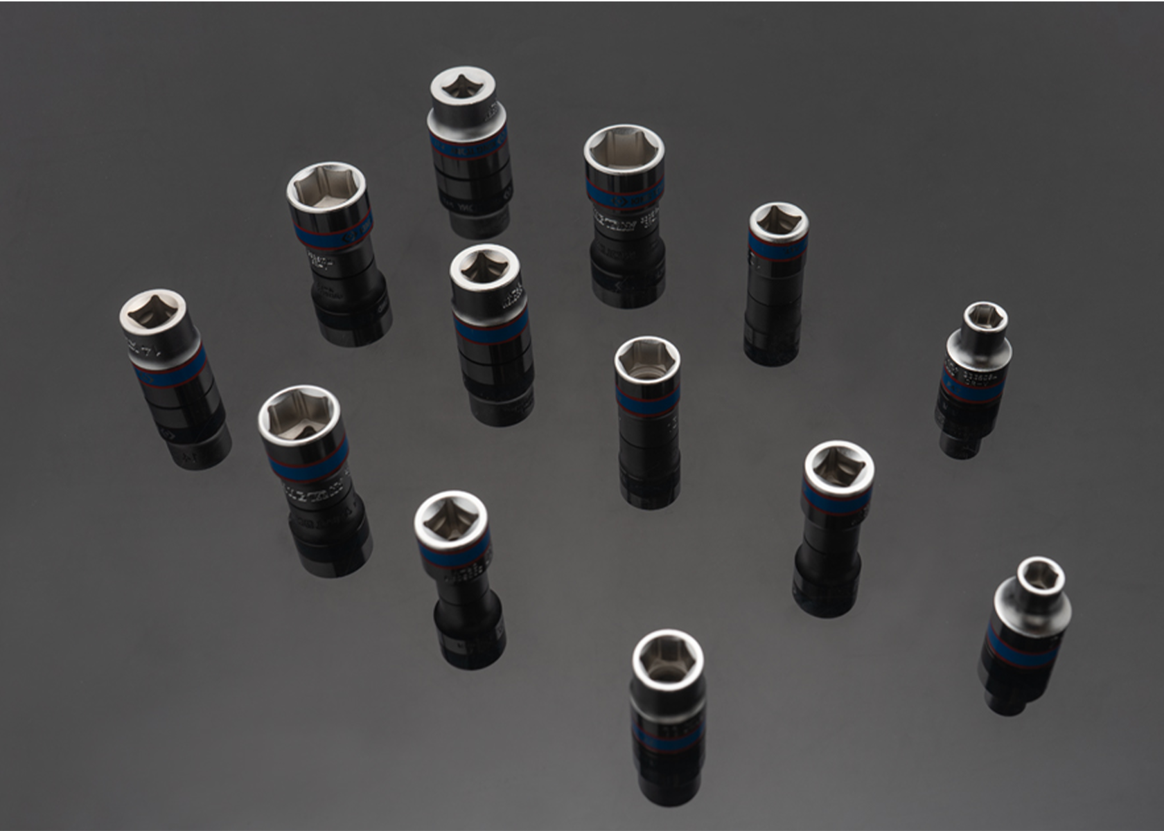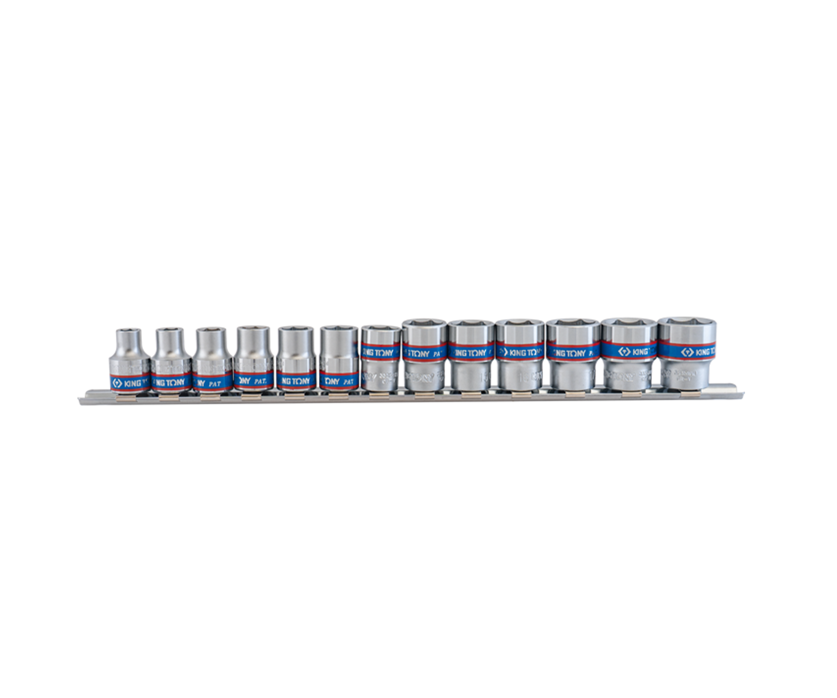 King Tony ⅜" DR. 6 Point Socket Rail Set – набір з 13 торцевих головок довжиною 27 мм з шестигранним внутрішнім профілем на планці для ручного та електроінструменту. Виконані з легованої хромомолібденової сталі. На боках головок вигравіровані лазером їх артикули.