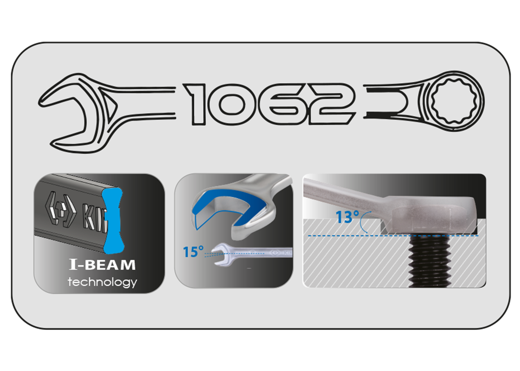 Рукоятки ключів створені за допомогою технології I-BEAM technology. Її суть – перетин ручки нагадує форму двотаврової балки (I-подібний профіль). Це інженерне рішення, спрямоване на оптимальний баланс міцності, ваги та ергономіки, оскільки ключ посилено за рахунок форми профілю, а не за рахунок збільшення кількості металу.