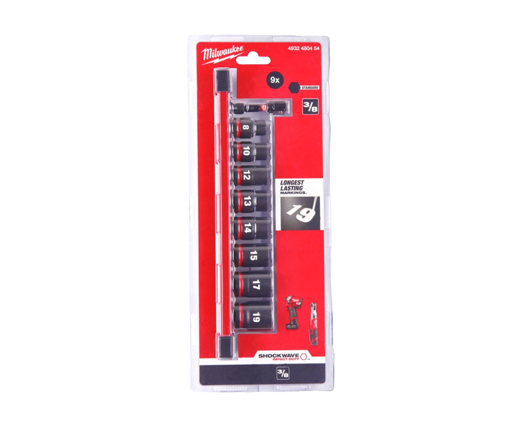 Milwaukee ⅜″ Impact Socket STD Set 9pc – набір із восьми ударних торцевих головок із шестигранним внутрішнім профілем на планці. Підходять для роботи з високими навантаженнями з використанням ударних інструментів. Можуть використовуватися також для ручного інструменту. Виконані з легованої хромомолібденової сталі.